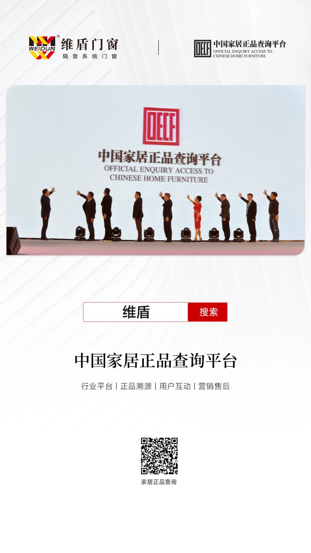 中國(guó)家居正品查詢(xún)平臺(tái),簡(jiǎn)稱(chēng)“正品搜”,是由中國(guó)質(zhì)量認(rèn)證中心發(fā)起的家居行業(yè)統(tǒng)一環(huán)保追溯平臺(tái)。平臺(tái)給維盾每樘門(mén)窗分配唯一身份編號(hào),記錄其生產(chǎn)、質(zhì)檢、物流、銷(xiāo)售等信息,消費(fèi)者掃描二維碼,即獲知所購(gòu)買(mǎi)商品的一切信息。防偽查詢(xún)還實(shí)現(xiàn)了消費(fèi)者和工廠(chǎng)的點(diǎn)對(duì)點(diǎn)互動(dòng),保證商品信息絕無(wú)虛假。